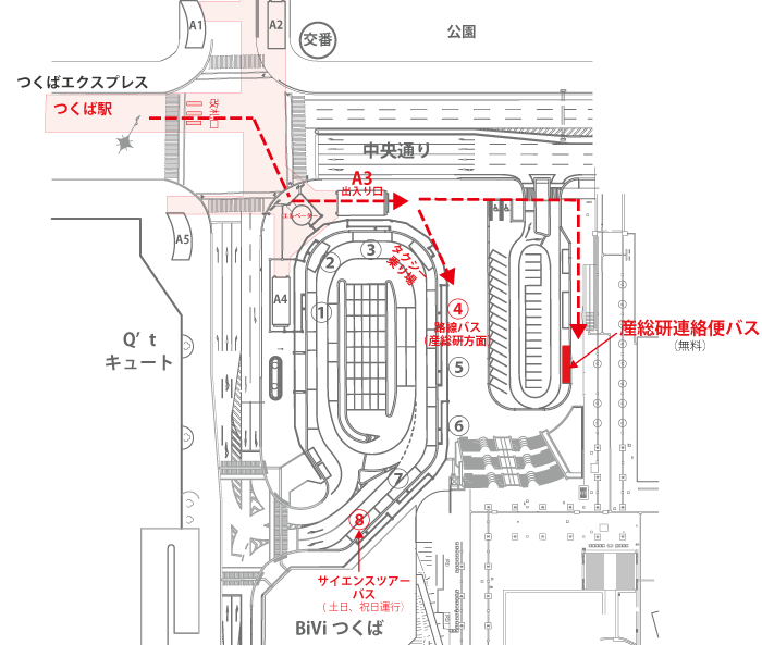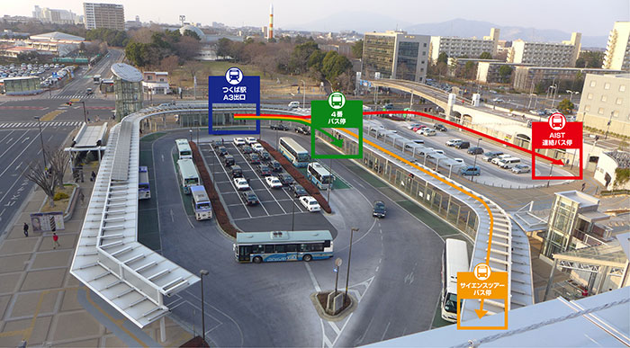 つくばバスターミナル 4番バス停から関東鉄道バス「荒川沖駅(西口)行(並木経由)」、「筑波宇宙センター経由(学園南循環)」または「桜ニュータウン行」にご乗車、「並木二丁目」で下車してください。